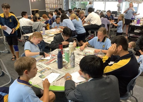 グループに分かれ、生徒たちが英会話文作成、劇形式での発表を行っています。