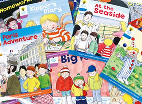 授業ではCDによる読み聞かせや音読、内容の理解度を測る英語での口頭試問を実施。ORTのレベル別絵本で多読の機会を設けています。